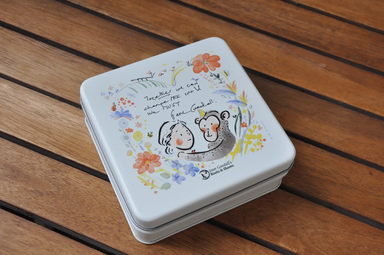 This illustration was created for a cookie tin cover as part of a fundraising initiative for the Jane Goodall Institute Japan’s Roots & Shoots program.